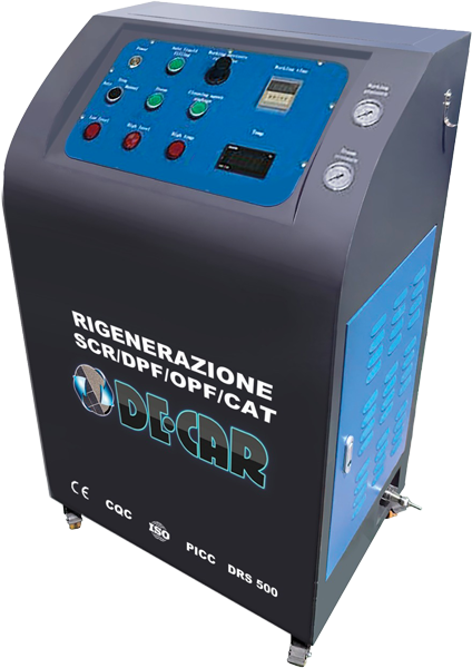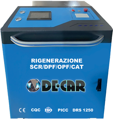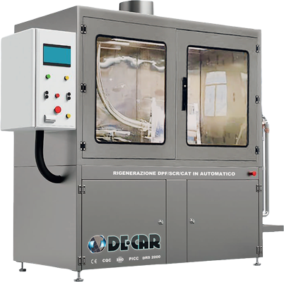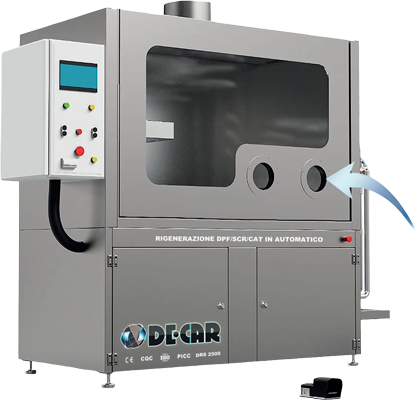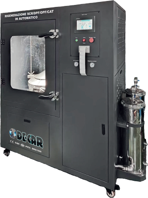 Macchina per la pulizia SCR/DPF, adatto per la pulizia del filtro antiparticolato euro 4 - 5 - 6 di auto, autobus, furgoni e camion. Pompa maggiorata e riscaldamento a 3 filtri. Cicli di pulizia automatici e possibilità di lavaggio manuale dei pezzi attraverso i guanti a tenuta stagna negli appositi portelli.